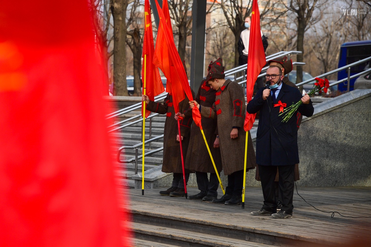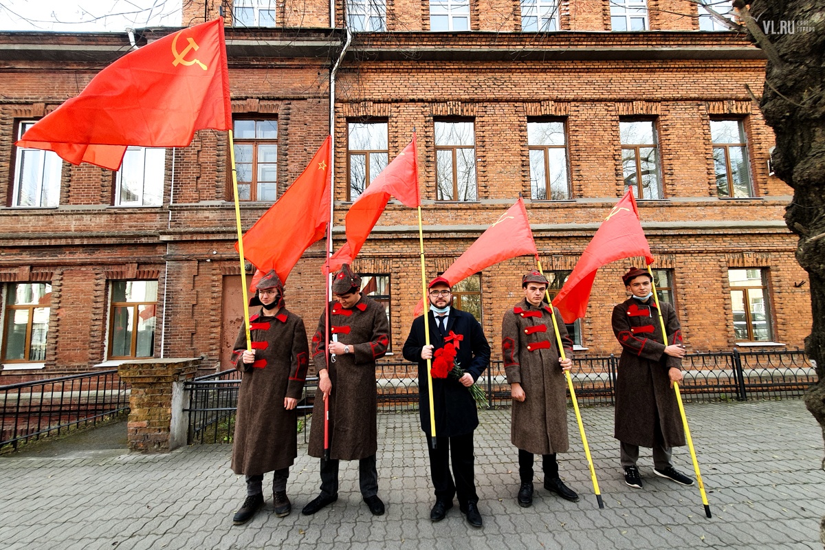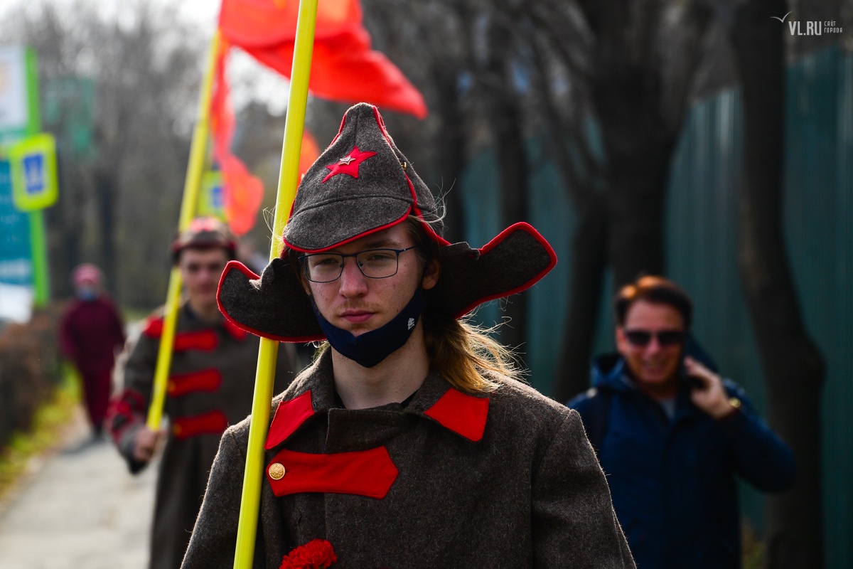 Началось празднование со сбора у отделения городского комитета Компартии (ул. Пушкинская, 25в), рядом с корпусом бывшего ДВГТУ. В полдень здесь было около 50 человек, которые разбирали советские флаги, знамёна с партийной символикой, портретами Сталина с Лениным. Здесь же желающие могли получить бесплатные защитные маски. Поучаствовать в массовой акции пришли студенты из Приморского комсомола, симпатизирующие идеям КПРФ, депутаты городской Думы и Законодательного собрания края — Александр Шукевич и Артём Самсонов. Несколько парней по традиции нарядились в тематические красноармейские шинели с будёновками и тельняшки с бескозырками, изображая борцов за свободу трудового народа образца 1917 года.