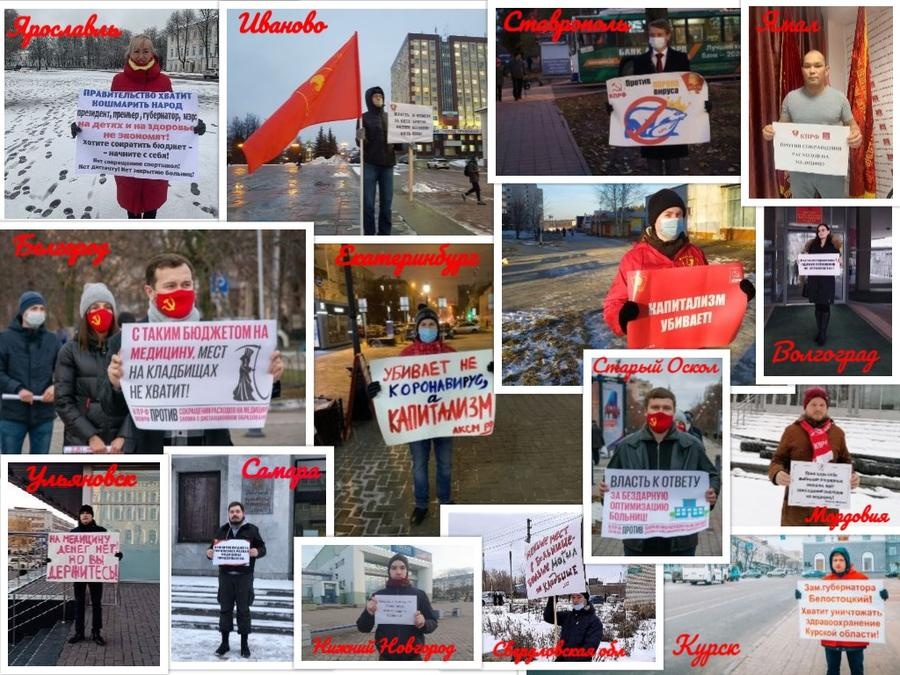 Главные лозунги акции: Наоптимизировались? Здравоохранение не справляется. Как и капитализм! / Власть к ответу за бездарную оптимизацию больниц! /Капитализм убивает! /Кпрф против сокращения расходов на медицину! /Пока царь себе выбивает очередные плюшки, идёт сокращение расходов на медицину! /Хватит нас пролечивать, пора лечить! /Убивает не коронавирус, а кризис власти!/ Медицина при капитализме: выживет кто побогаче /Принятие бюджета показывает: Развал медицины продолжается. /Долой самодержавие! За социализм!