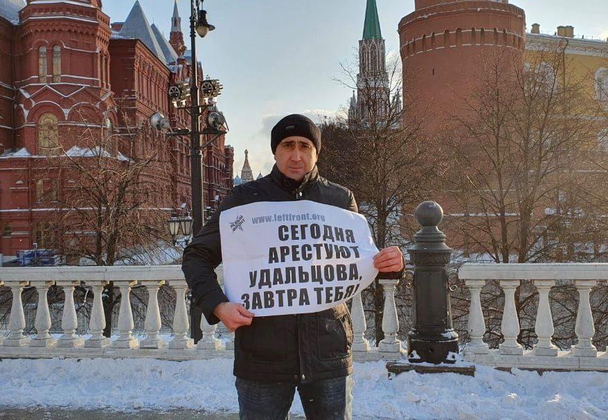 В Москве активисты и сторонники Левого фронта вышли на одиночные пикеты в поддержку арестованного три дня назад Сергея Удальцова и других политзаключенных.