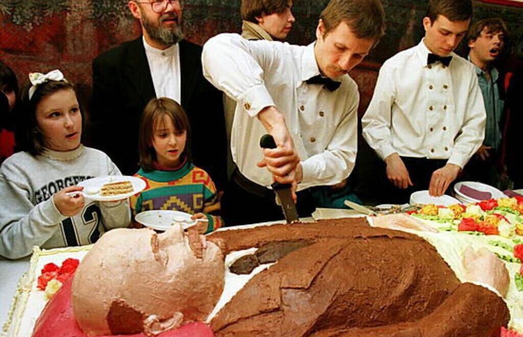 Ещё бы! И в самом деле, «одни ругали её, другие смеялись, третьи злорадствовали». Во мне-то до сих пор остаётся чувство невероятного шока, возникшее тогда перед телеэкраном, а теперь вновь обострённое напечатанным в газете. Ведь жуть жуткая на снимке. Люди разных возрастов (даже дети!) теснятся вокруг ленинского гроба с тарелками в руках, орудуют над «телом» официанты с ножами, и отрезанные куски тут же смачно поедаются. Газетная подпись гласит: «Попробуй Ленина на вкус».