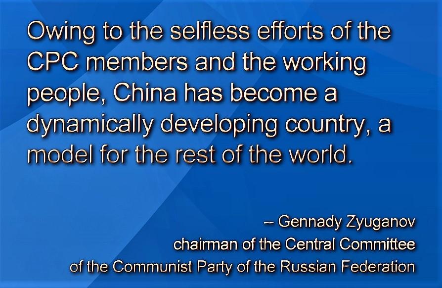 На просьбу дать оценку роли КПК в развитии теории и практики международного коммунистического движения Г.А. Зюганов подчеркнул тот факт, что сегодня Китай вносит определяющий вклад в мировое движение за социализм и является локомотивом всемирно-исторического прогресса. Своими грандиозными успехами Пекин демонстрирует преимущества социалистического пути развития всему миру. Некогда бедная аграрная страна, раздираемая внутренней враждой и разоряемая иностранными захватчиками, превратилась в ведущую державу планеты. Под руководством КПК она бросает вызов традиционным центрам глобального влияния в лице США и Западной Европы.