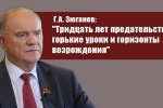 Именно тогда был сделан роковой шаг к разрушению первого в мире государства рабочих и крестьян, общества социальной справедливости. Его создание и достижения стали вершиной нашей тысячелетней истории. А его развал привёл к падению отечественной экономики, разгрому промышленности и науки, деградации медицины и образования, ликвидации социальных гарантий, которым не было равных в мире. По сей день мы пожинаем горькие плоды этой катастрофы, отнявшей у народа выдающиеся социалистические завоевания, которыми гордились наши предки. И которые они отстояли ценой десятков миллионов жизней на полях Гражданской и Великой Отечественной.