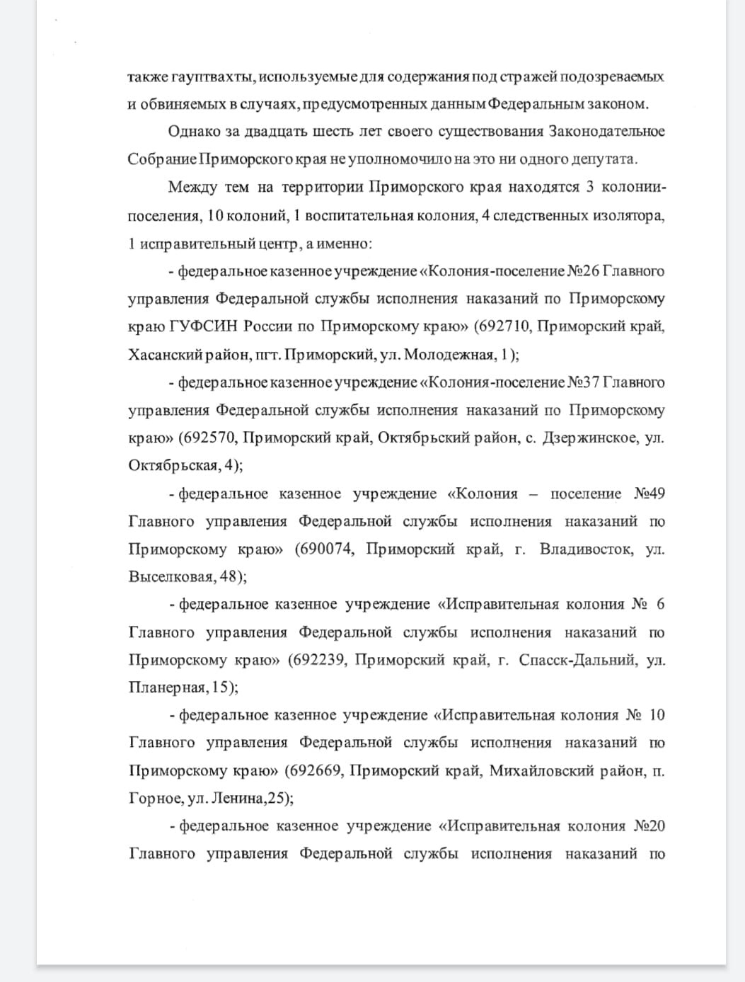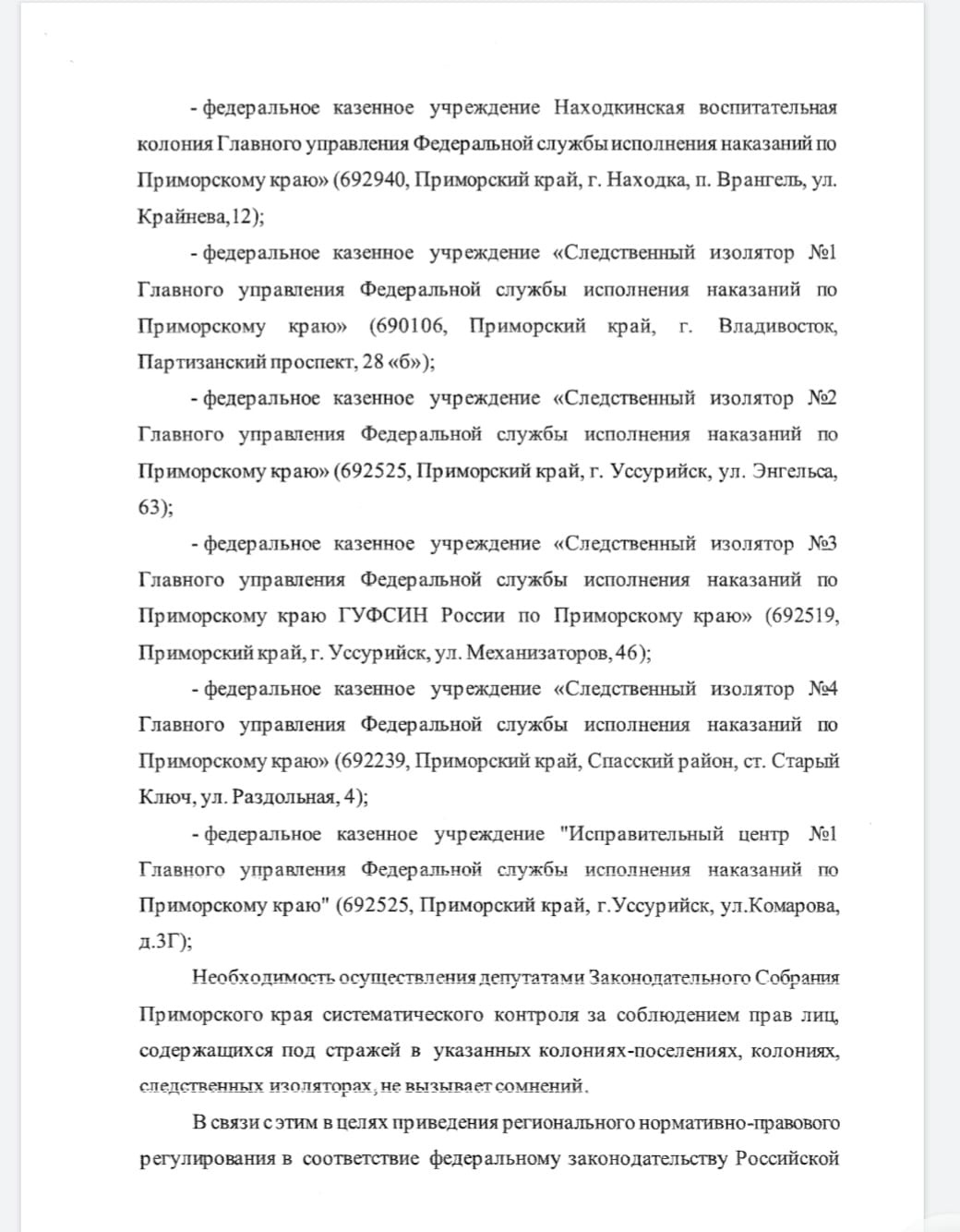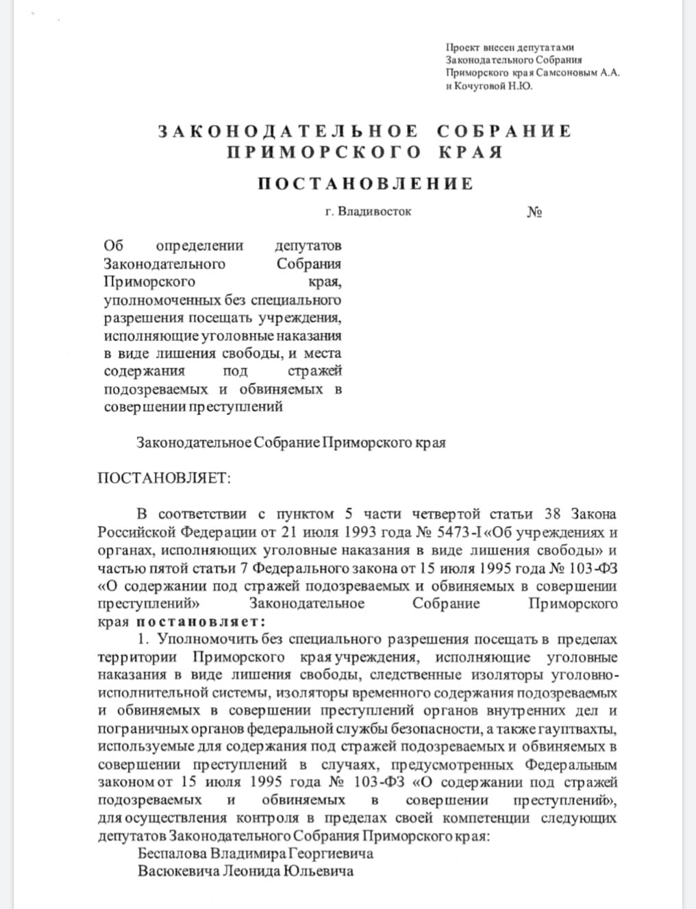 С целью организации депутатского контроля за условиями содержания лиц в местах лишения свободы Владимир Найдин поддержал законодательную инициативу депутатов Самсонова А.А. и Кочуговой Н.Ю. о наделении отдельных депутатов Законодательного Собрания Приморского края полномочиями посещать учреждения уголовно-исполнительной системы на территории Приморского края без специального разрешения, поданную в ЗС ПК в середине января 2022 года.