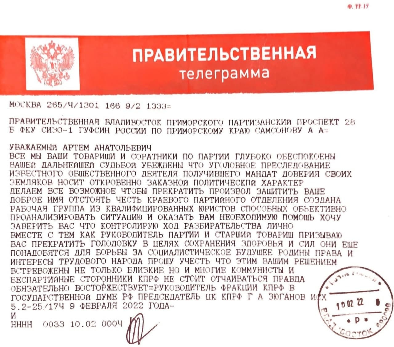 Во-вторых, я получаю множество ваших сообщений с просьбой прекратить голодовку. А на этой неделе я получил решение бюро Приморского краевого отделения КПРФ, которое считает, что моя жизнь даже здесь в тюрьме важна для партии. Я не могу проигнорировать ваши обращения, и я не могу не выполнить решение бюро.