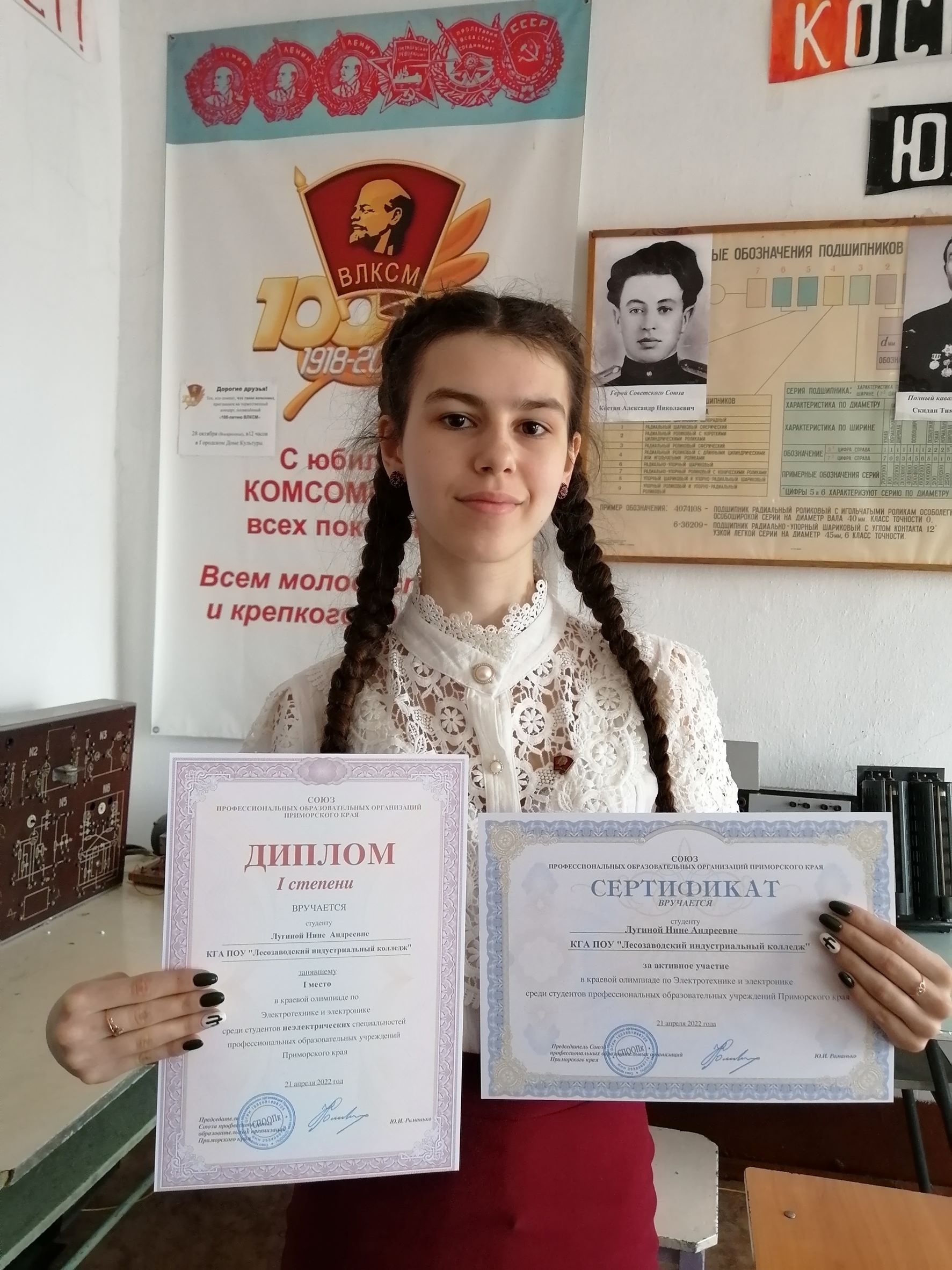 А решающий шаг к успеху был сделан в начале апреля, когда она заняла I место во внутриколледжной олимпиаде среди 20 студентов, изучающих электротехнику, что дало ей право поехать на олимпиаду краевую. Нина считает, что наша победа – это достойный вклад в копилки славных дел родного колледжа, любимого города на берегах Уссури, Лесозаводского комсомола и Почётных жителей ЛГО. Я с ней полностью согласен.