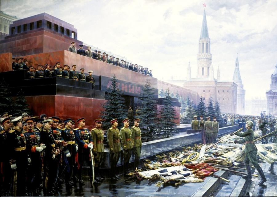 Мимо Мавзолея шли войска народного ополчения на фронт в дни Московской битвы. К Мавзолею были брошены флаги и штандарты поверженных советскими воинами фашистских армий и дивизий.