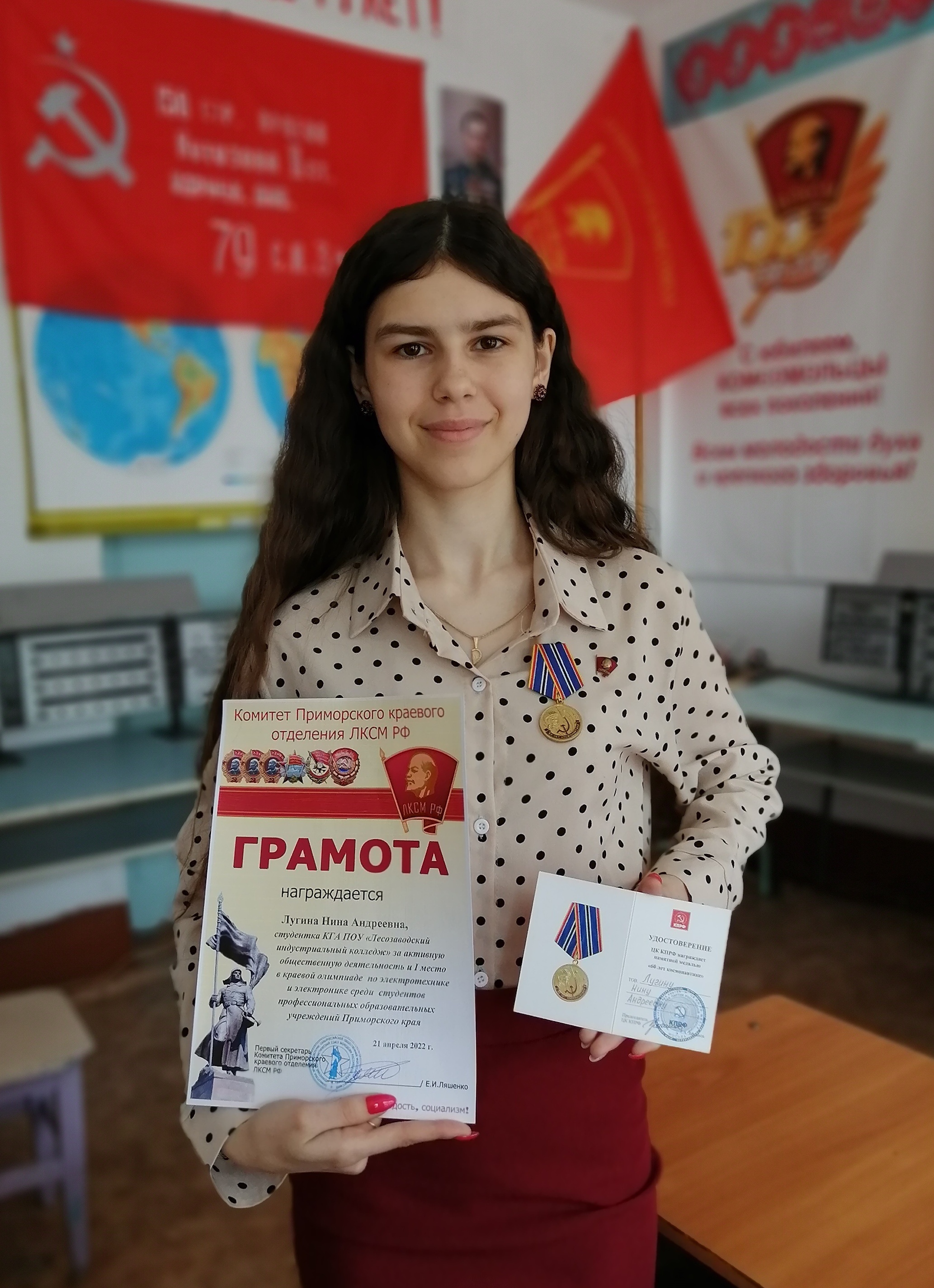 В этот исторический день поздравления и заслуженные награды принимала Нина Лугина – победительница (I место) краевой олимпиады по электротехнике и электронике среди студентов профессиональных образовательных учреждений Приморского края, отличница учёбы, староста группы, секретарь первичного отделения ЛКСМ.