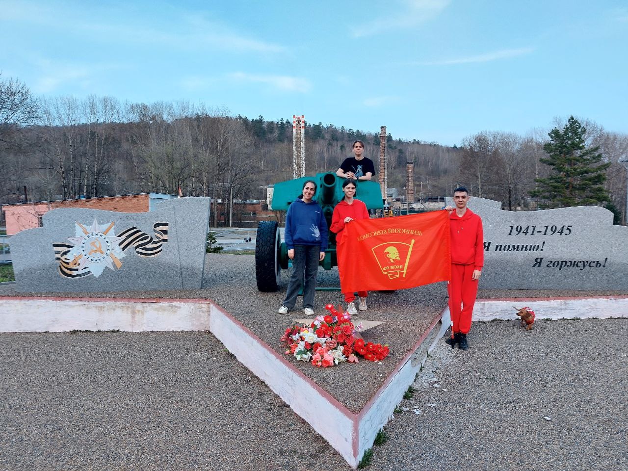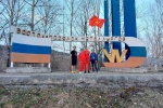 На обратном пути Комсомольское Знамя гордо развевалось у памятника «Пушка» возле администрации и на Стелле посёлка Восток.