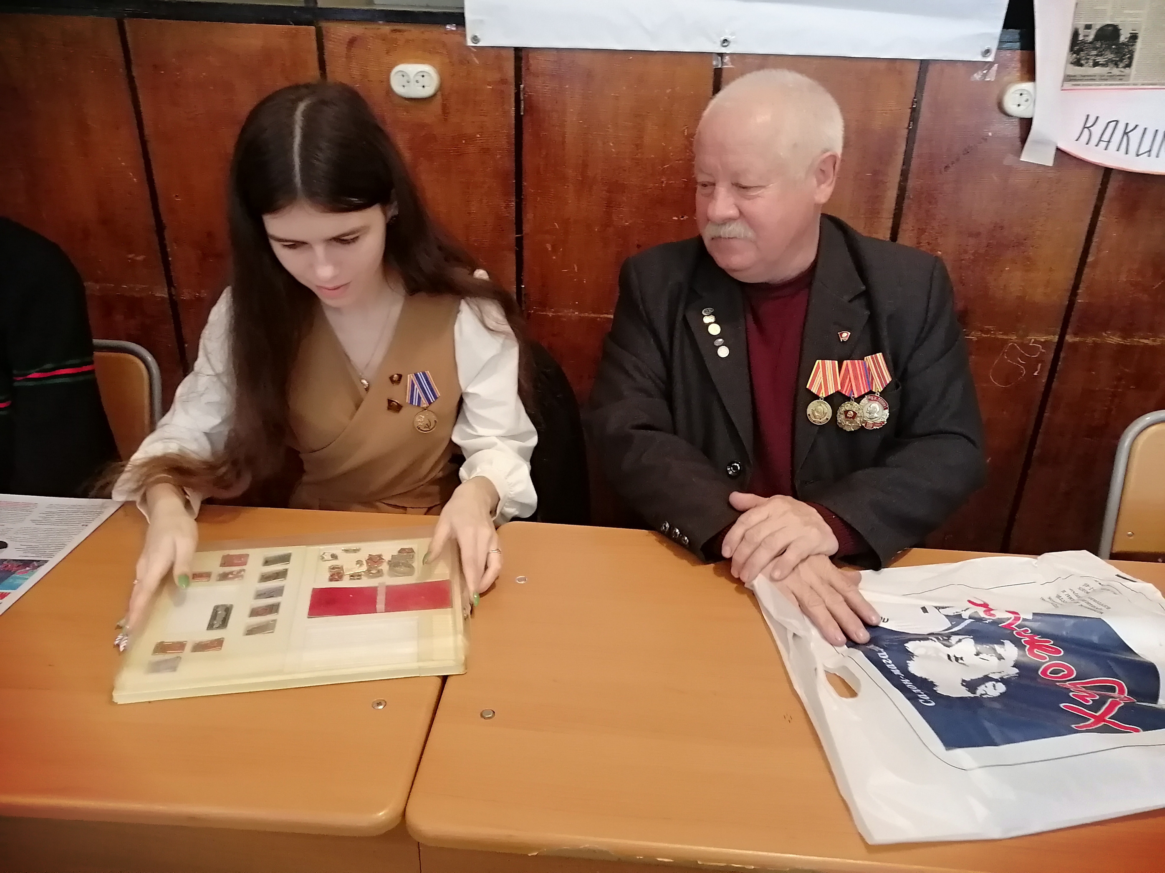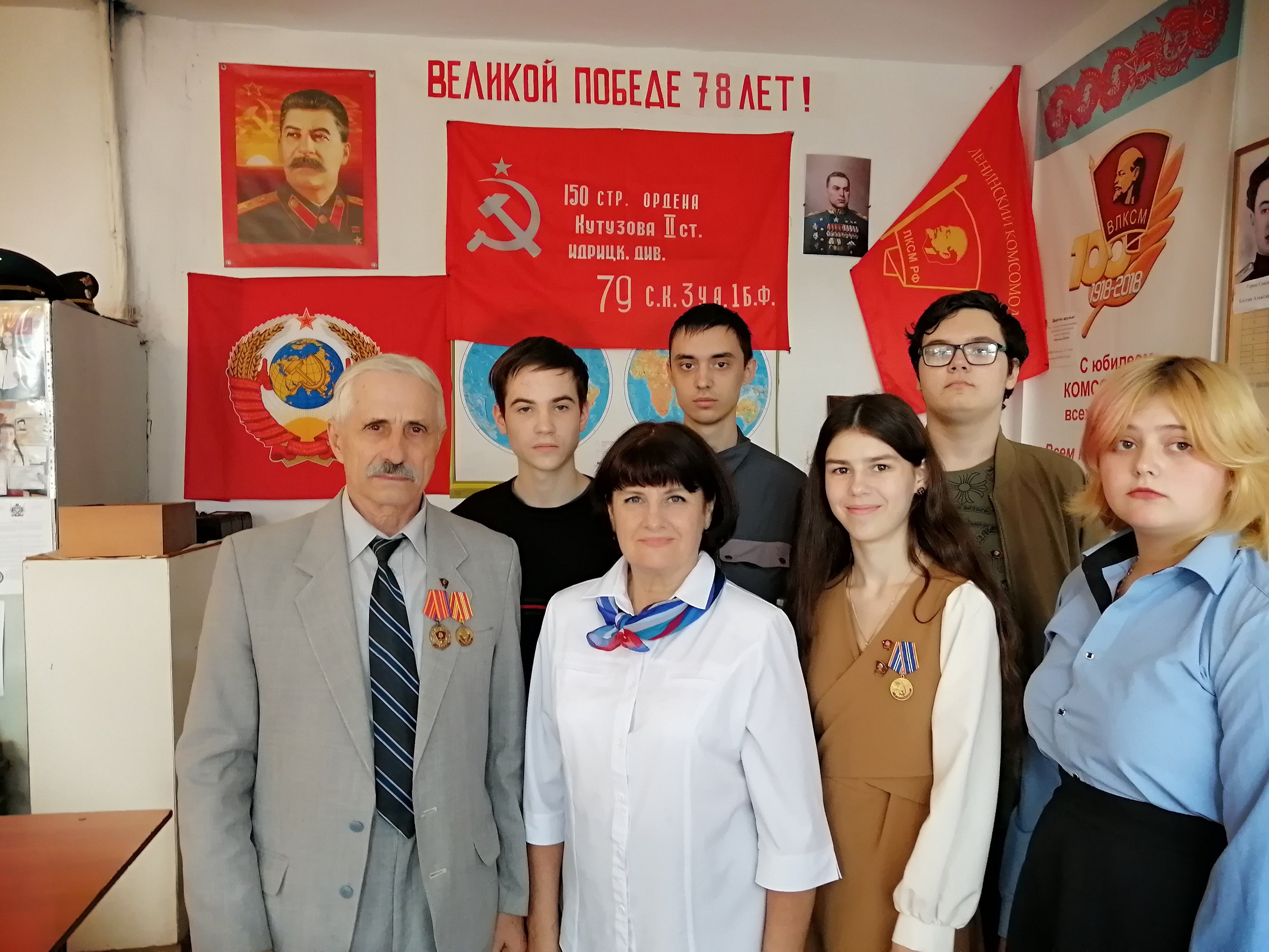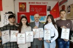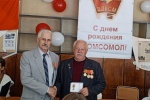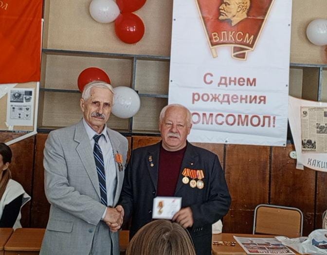 Здесь же, в торжественной обстановке «круглого стола» Владимира Сергеевича ожидал сюрприз: за большую работу по патриотическому воспитанию молодёжи от имени ЦК КПРФ он был награждён памятной медалью «В ОЗНАМЕНОВАНИЕ СТОЛЕТИЯ ОБРАЗОВАНИЯ СССР». Он же, в свою очередь, подарил нашим комсомольцам набор пионерских и комсомольских значков периода его работы в комсомоле.