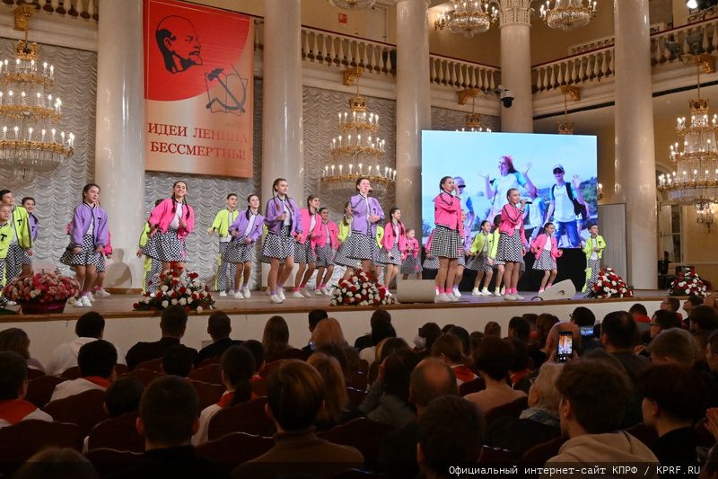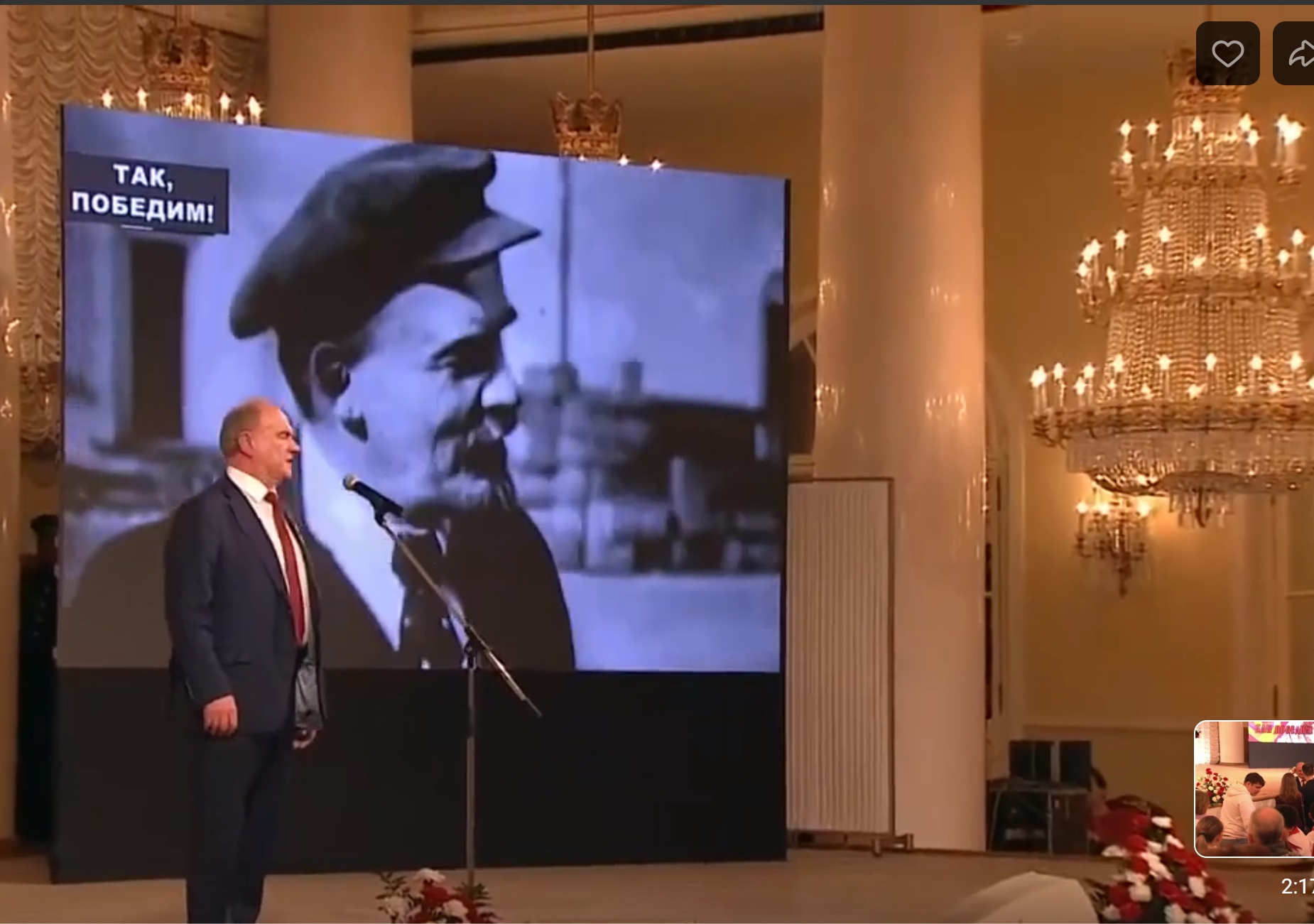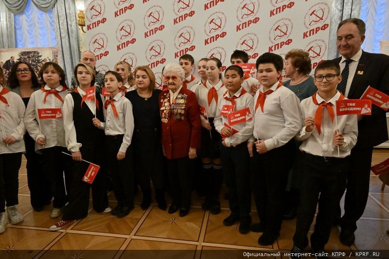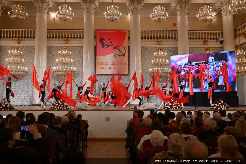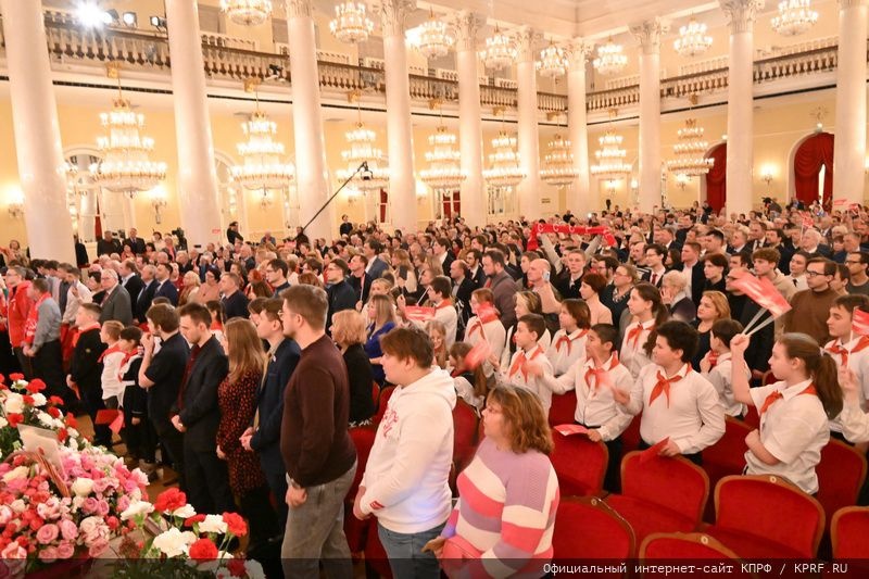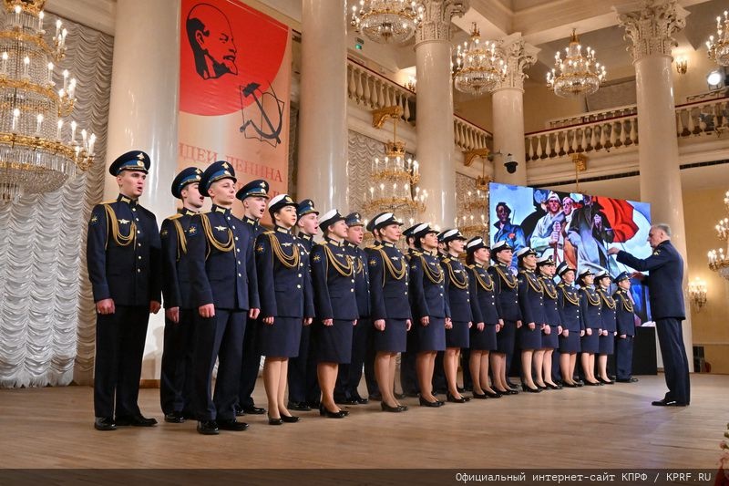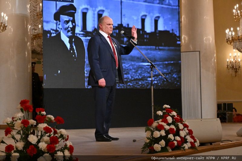 Наша партия последовательно проводит эту уникальную политику. Наш главный лозунг: «Мы верны великим заветам Ленина». Мы верны великой клятве Сталина, который здесь, в Большом театре на II Всесоюзном съезде советов произнес, продолжая Ленина в последний путь: «Клянемся укреплять нашу партию». И мы воссоздали Компартию Российской Федерации, которая сейчас является ведущей патриотической силой нашей страны, и предложили программу мирного, достойного выхода из этого кризиса. Здесь сидят руководители нашей партии, комсомольцы, пионеры, депутаты. Давайте их поприветствуем и поблагодарим за то, что они верно идут дорогой Ленина, дорогой Октября.