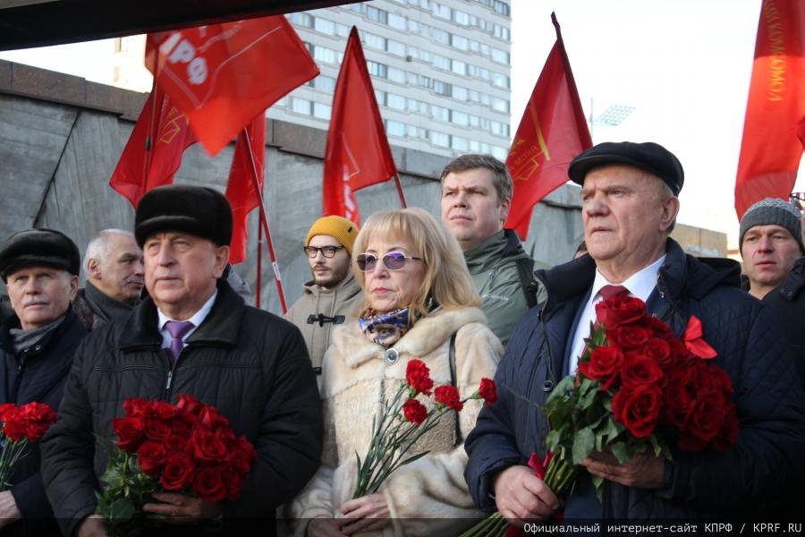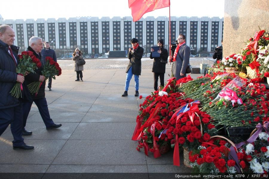 Второй день рабочего визита делегации ЦК КПРФ начался с возложения цветов к памятнику В.И. Ленину у здания Смольного.