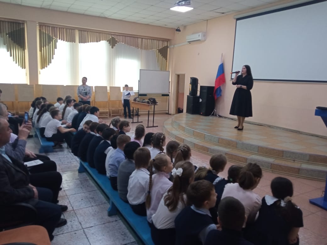 После сообщения прозвучала песня "Встанем" в исполнении ученицы 11" Б" Сухоцкой Д. Яркий пример современной высокоидейной патриотической песни в талантливом исполнении!