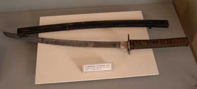 В войне с Японией Тихоокеанский флот вел самостоятельные боевые действия по нарушению коммуникаций противника в Японском море. Как и в годы Великой Отечественной войны флотом продолжал командовать адмирал Юмашев И.С. (показ: фото, грамота о присвоении звания ГСС, трофейная сабля). Для решения этой задачи командование флота использовало разнородные силы, включая подводные лодки, авиацию, торпедные катера, которые вели боевые действия в оперативном взаимодействии, нанося удары по японским кораблям и транспортам и в море и в портах. На позициях действовали подводные лодки, которые также несли дозорную службу у баз флота и устанавливали минные заграждения (показ фото). 18 августа 1945 г . японский самолет, управляемый летчиком-камикадзе, был обнаружен в небе Владивостока. Самолет был сбит зенитной установкой с танкера "Таганрог" (показ: памятная доска, награды Лещенко З.Ф., лопасть винта японского самолета).