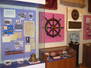 Южно-Сахалинская наступательная операция проводилась в период с 11 по 25 августа 1945 г . войсками 16-й армии 2-го Дальневосточного фронта при содействии базировавшейся в Советской гавани Северной Тихоокеанской флотилии, которой командовал контр-адмирал Андреев В. А.. Совместные действия СТОФ с войсками армии развертывались успешно. Флотилия, по мере продвижения 16-й армии на юг, последовательно высадила несколько тактических десантов в тылу оказывавшего ожесточенное сопротивление противника и заняла порты Торо (Шахтерск), Эсуторо (Углегорск), Маока (Холмск) и Отомари (Корсаков). 16 августа десантный отряд, в составе которого были сторожевые корабли, минные заградители, тральщики, торпедные и сторожевые катера (всего 30 вымпелов) высадил в порт Торо 365 отдельный батальон морской пехоты и 2-й батальон 113-й стрелковой бригады. Высадку прикрывала авиация флотилии (80 самолетов). Командиром высадки был назначен капитан 1 ранга А.И. Леонов, командиром десанта - полковник К.П. Тавхутдинов. 17 августа над г. Торо был поднят советский флаг, в тот же день морские пехотинцы и части, наступающие со стороны Торо, овладели портом и городом Эсуторо. Высадка десанта в Маока протекала в сложной метеорологической обстановке, при сильном противодействии японцев. 20 августа порт Маока был взят сводным батальоном моряков (показ фото). В составе 5-ти отрядов кораблей, осуществлявших высадку десанта в Маока, был транспорт "Всеволод Сибирцев" (показ: машинный телеграф, знамя с "Вс. Сибирцева"). Капитаном судна был Н.П. Манжолин (фото), служивший в 20-е годы на "Красном Вымпеле". 25 августа был освобожден и порт Отомари.
